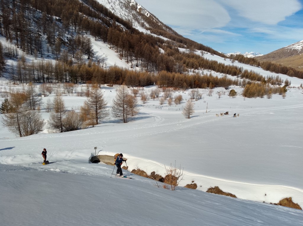 Départ du Pont de Lariane, sur la route menant au Col Agnel, non déneigée. Un attelage de chiens de traîneau
