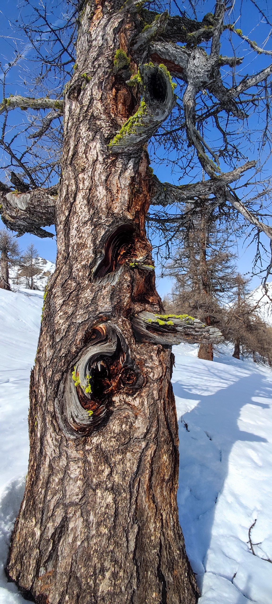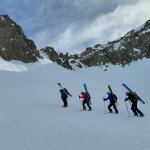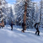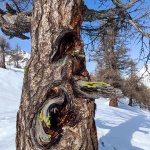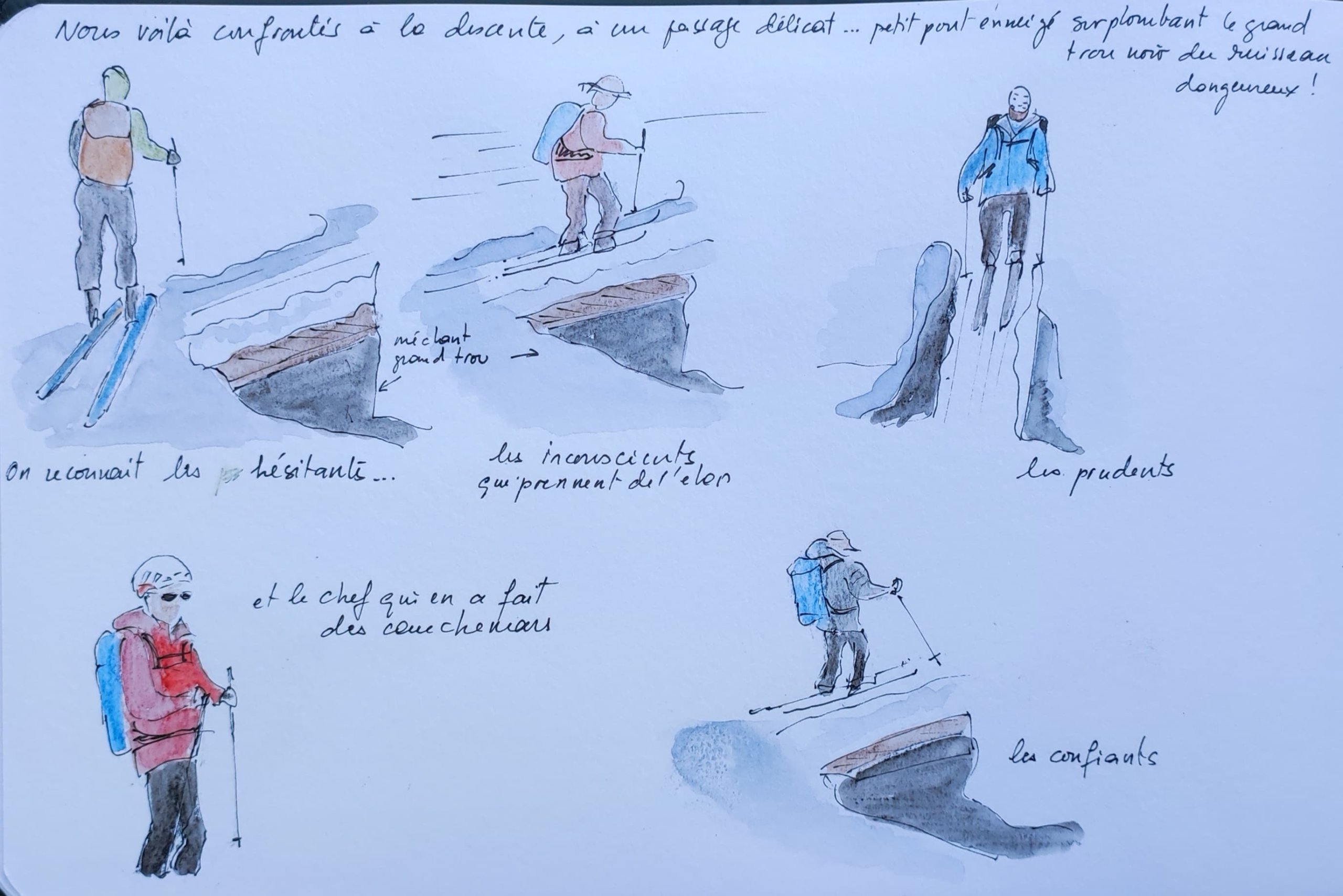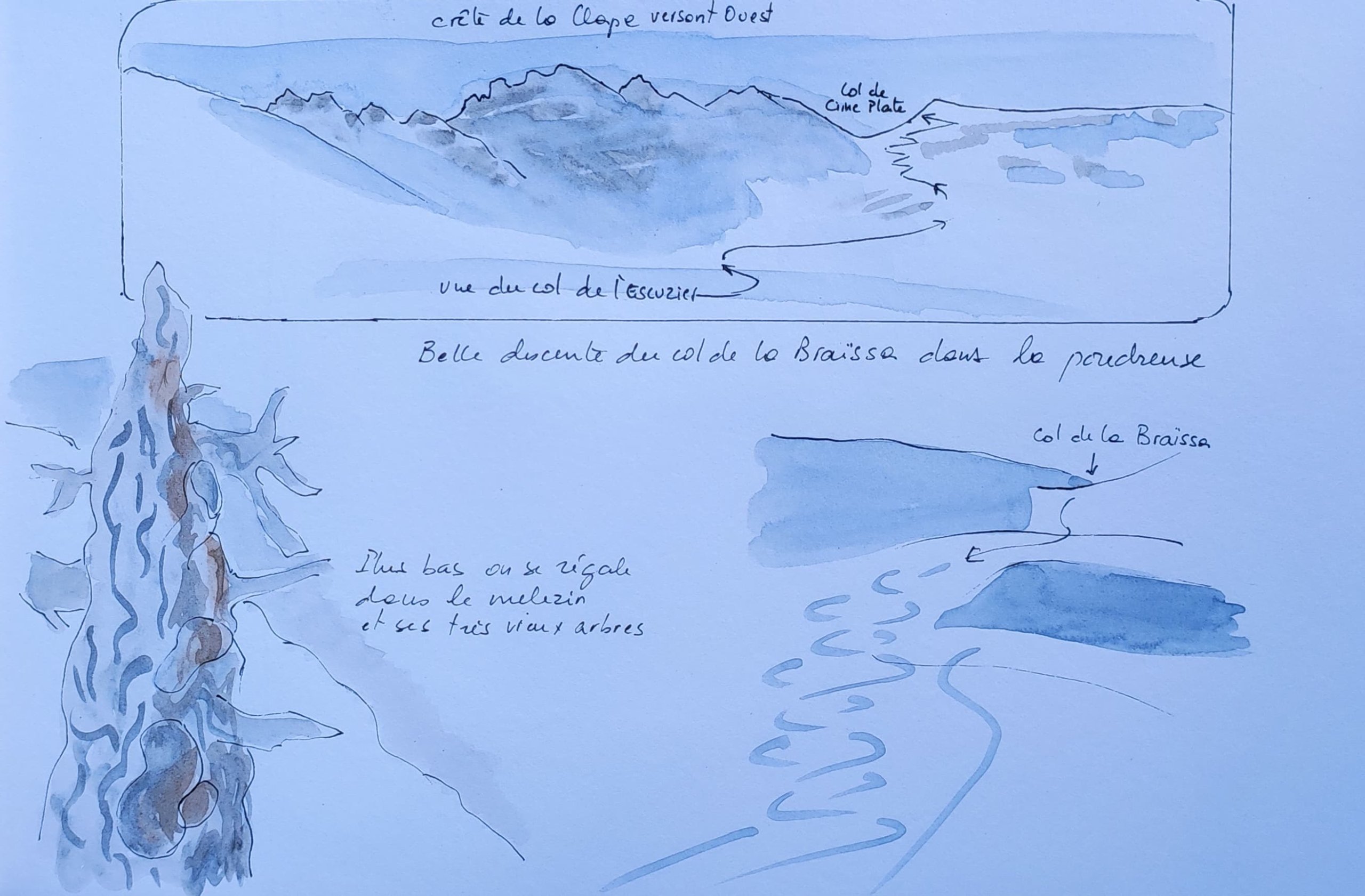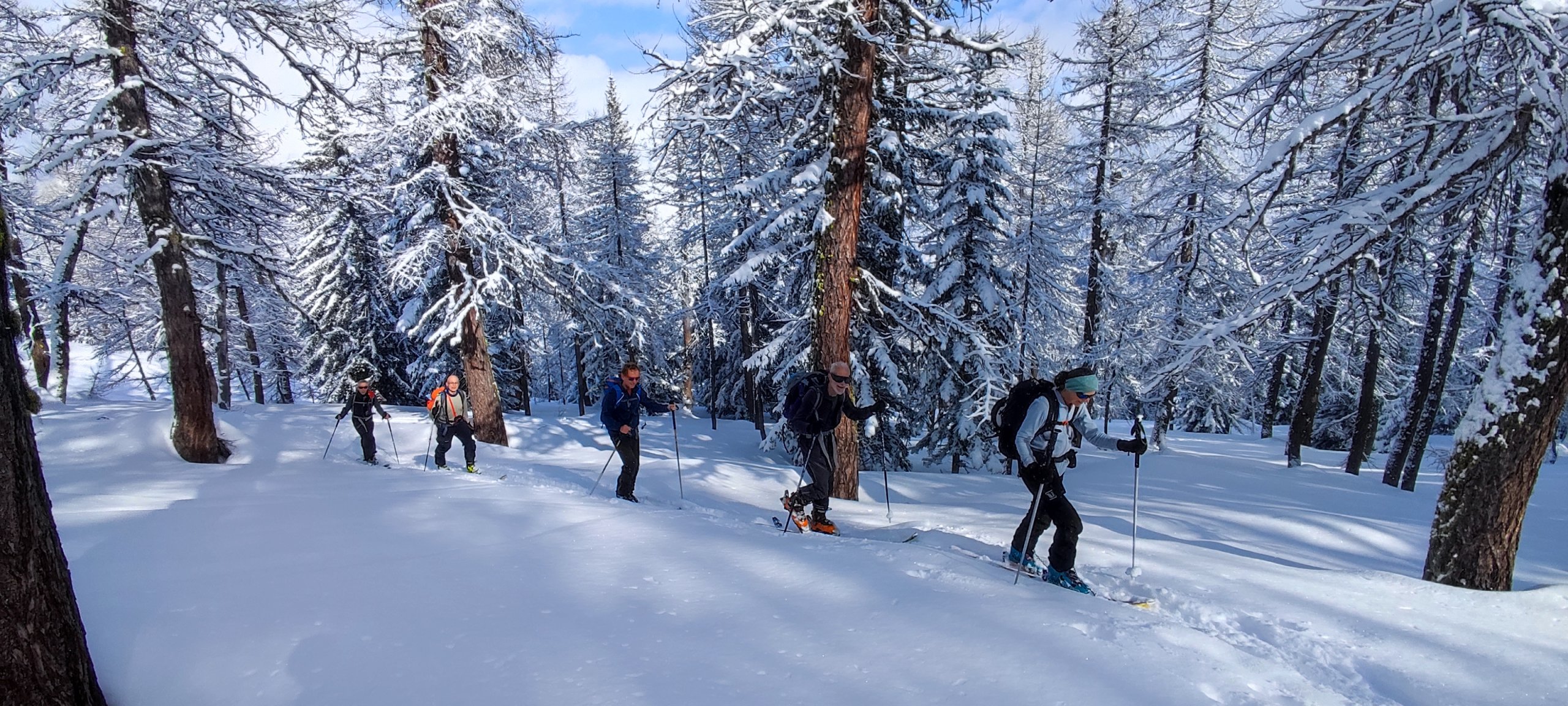 Notre plus longue journée, heureusement par beau temps avec un ciel juste assez voilé pour éviter la surchauffe. Ça commence par 5 km sur la route qui mène au col de la Moutière pour rejoindre le hameau de Sestrière. On poursuit encore quelques km dans le vallon de Sestrière (NO) avant de bifurquer plein ouest pour atteindre notre premier des 3 cols de la journée, le col de l’Escuzier (2487 m). Courte redescente dans le vallon de la Braissette en franchissant une petite corniche sous le col (pas réussi à convaincre Anne et Bea qu’il suffisait de se laisser glisser 🙂 ) pour remonter au col de Cime Plate (2728 m) juste sous la Tête de la Clape. Après un casse-croute bien mérité, belle descente plein sud en neige de printemps ramollie à souhait avant la dernière ascension de la journée au col de la Braïssa (ou Braisse) (2599 m). Plus qu’à se laisser glisser dans le beau vallon de la Braisse – encore un mélézin rempli de beaux et vieux (et oui ça n’est pas incompatible 🙂 ) mélèzes — pour rejoindre Sestrière. Une dernière petite surprise nous attendait toutefois avec un intense moment de stress quand il s’est agi de traverser une passerelle étroite et recouverte d’au moins 1 m de neige. Tout le monde a heureusement assuré ! Après les quelques derniers km de faux plat descendant, toute la troupe était heureuse d’enfin apercevoir Saint Dalmas dans une belle lumière de fin de journée.