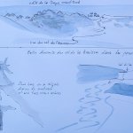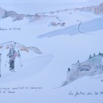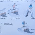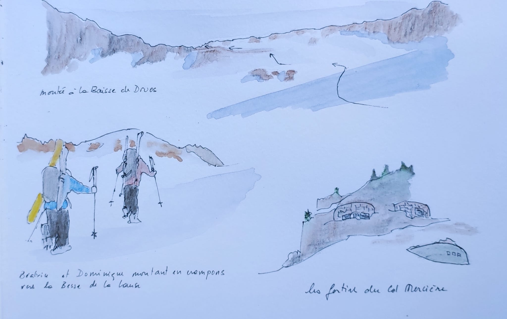 Philippe nous avait convaincu que ça valait le coup de faire un tour du côté d’Isola 2000 malgré les 45 min de voiture. Nous n’avons effectivement pas regretté avec ce parcours varié et sauvage, le beau temps étant enfin de la partie. Le programme de la journée était de faire le tour de la cime de Tavels (2795) en empruntant successivement la baisse du Druos (2628 m), la baisse de la Lause (2639 m) – en rendant visite à nos voisins italiens au passage — puis le col Mercière (2338 m) pour revenir sur Isola. Dommage que les lugubres blockhaus, vestiges de la 2ème guerre mondiale, plombent un peu l’ambiance à ce dernier col (Jean-Luc, un futur chantier « Installations obsolètes » avec MW ?). Ce fut incontestablement l’étape technique du tour avec des pentes soutenues en S4 pour atteindre les 2 premières baisses. Heureusement les crampons étaient bien dans le sac !