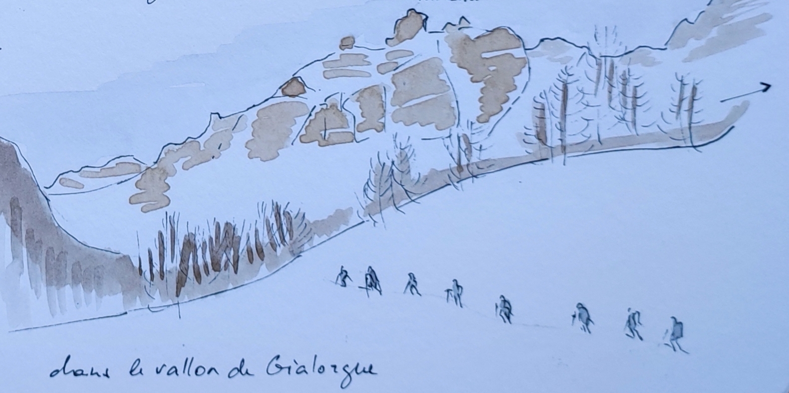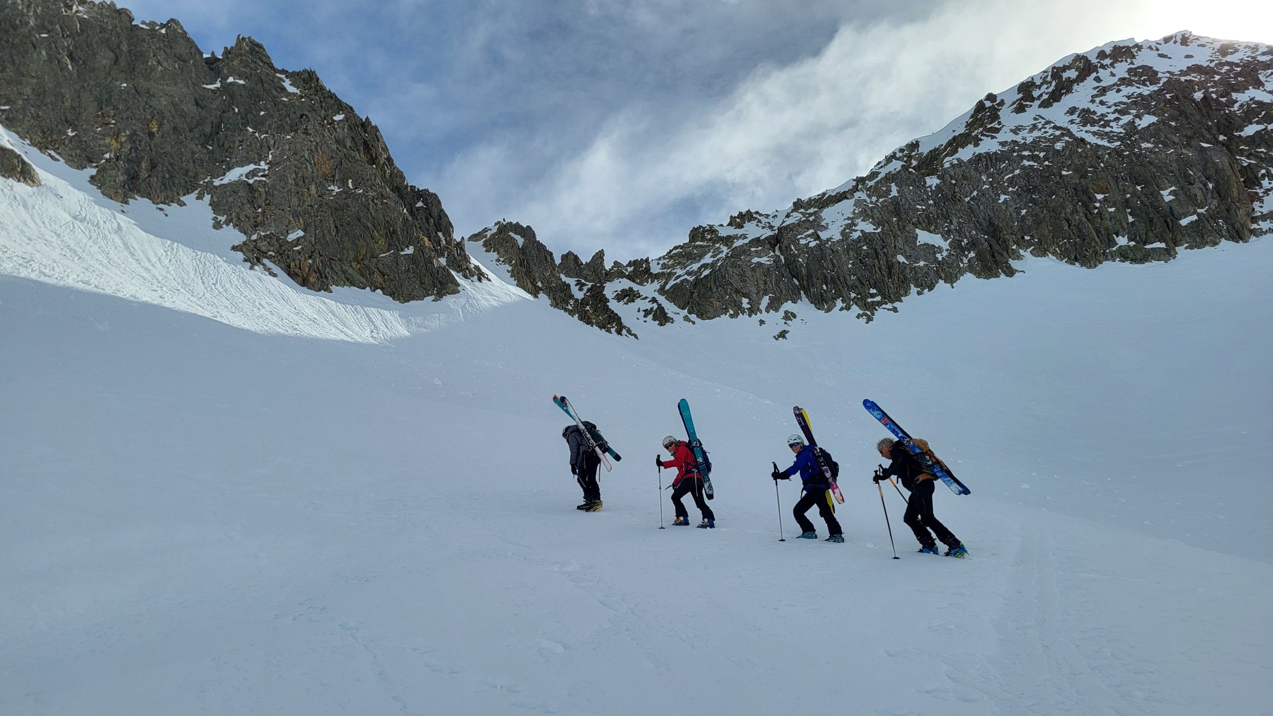 Pour cette dernière journée, objectif le col du petit Valloar (2706 m) au pied de la Tête Ronde, en suivant le vallon de Gialorgues. Encore un (long) faux-plat pour rejoindre le fond du vallon avant de pouvoir s’engager dans la combe sauvage qui mène au col, caché presque jusqu’au dernier moment par une impressionnante barre rocheuse. On ne s’éternise pas au col car le temps se gâte et redescente dans ce vallon très skiant malheureusement par jour blanc… Faudra revenir.