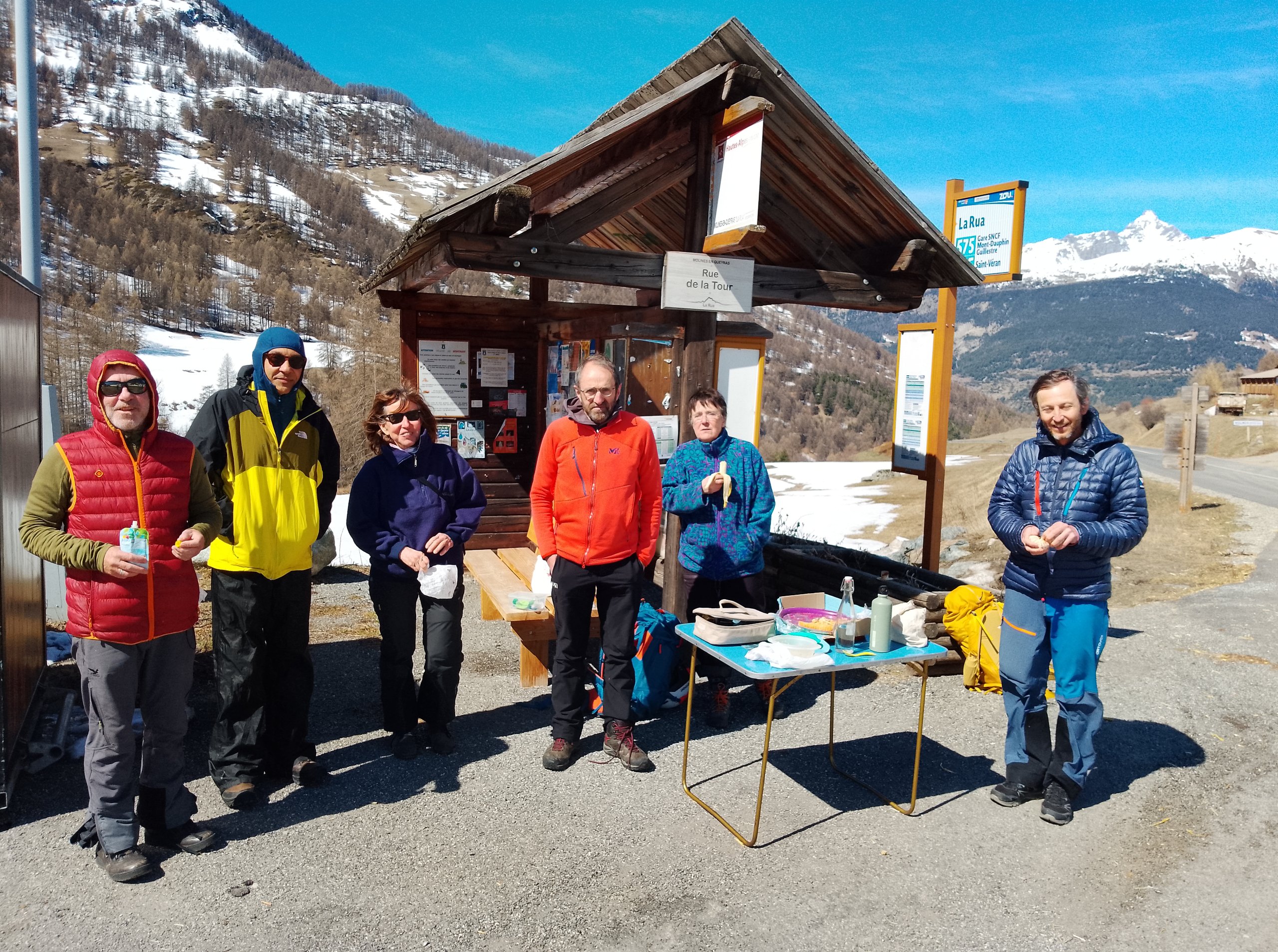 Rendez-vous au terminus du tram le Prisme, pour 8h, on passe chercher Patrice qui n’habite pas très loin et, en voiture pour Saint Véran. Traditionnelle pause café avant le col de Lus la Croix Haute. On passe Veynes, et on visite Gap… ! Vers midi, on fait notre casse-croûte au hameau de La Rua, qui sera le départ de notre remière randonnée : le Bois des Vallonnets (non loin du col des Prés du Fromage) . Progression agréable en forêt, mais qui devient scabreuse car on se heurte à une barre rocheuse, qui nous oblige à déchausser pour la contourner en bardolant dans la neige molle et profonde…