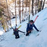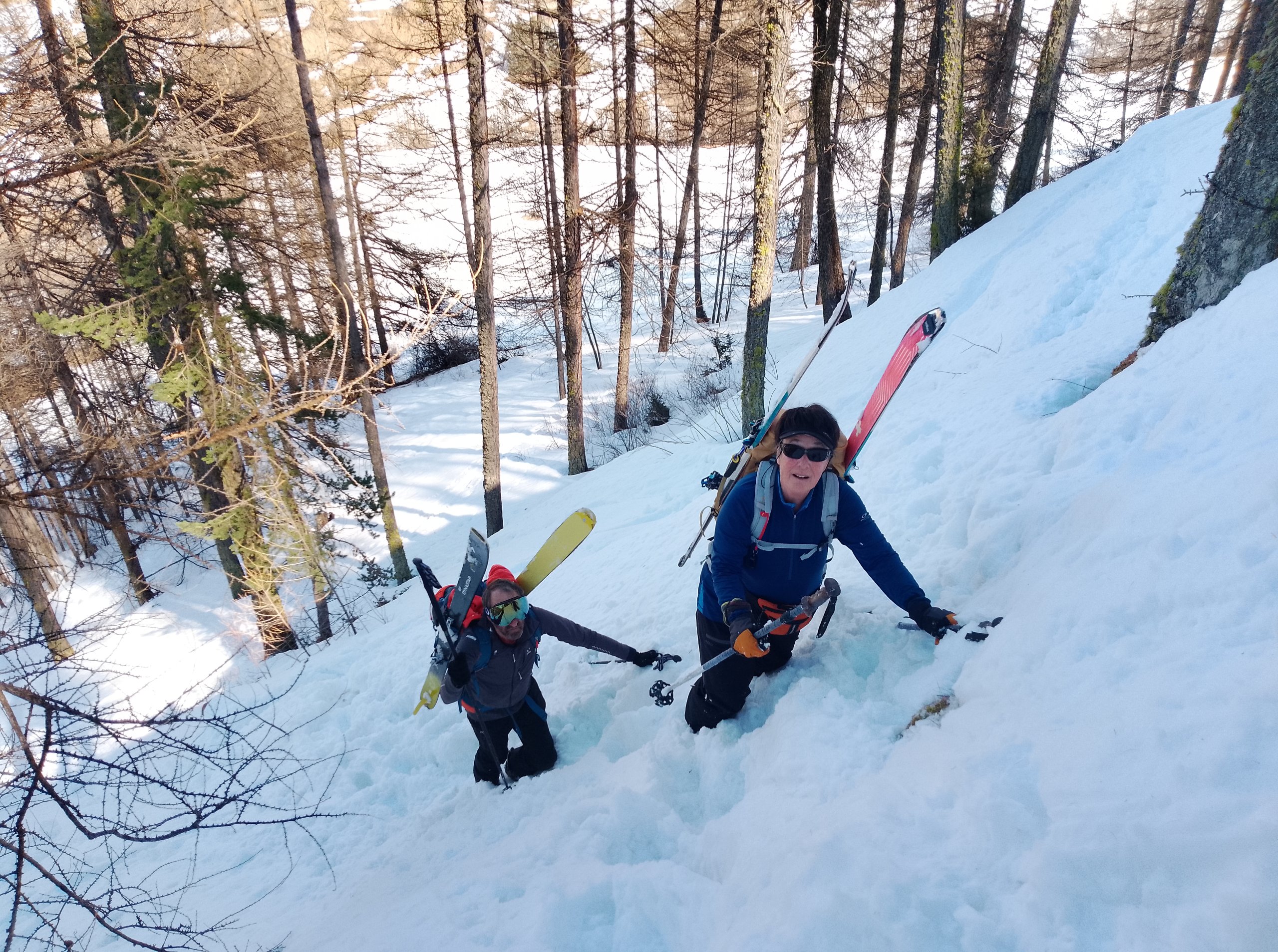 Ouf, on retrouve la piste qui nous remonte tranquillement entre les mélèzes jusqu’à l’altitude 2260m où nous décidons de dépeauter, il est déjà 16h30. Descente sportive entre les mélèzes, la neige est souvent poudreuse et on peut se régaler de beaux virages. Retour aux voitures, il est 18h, on file dare-dare au gîte des Gabelous ou le repas