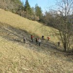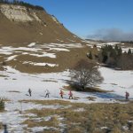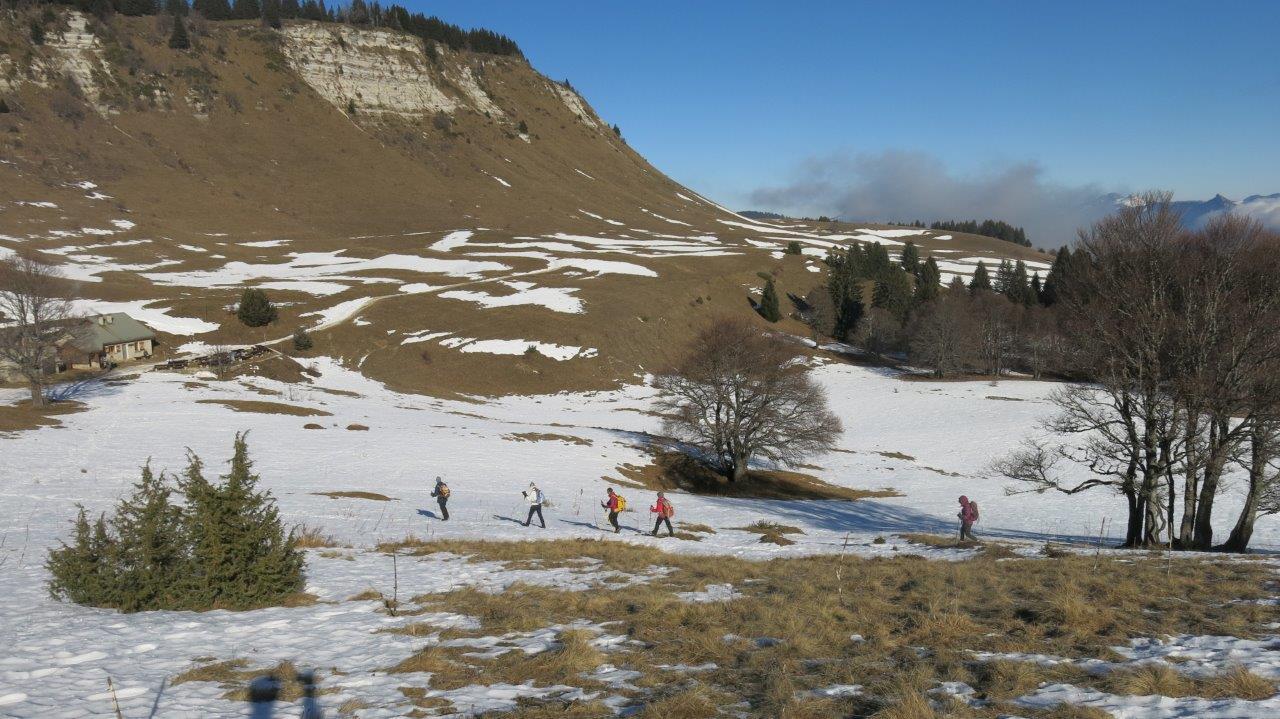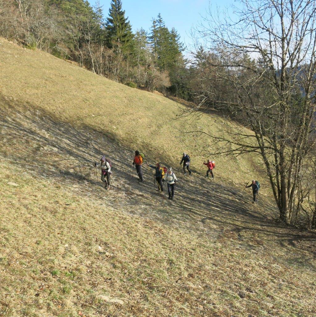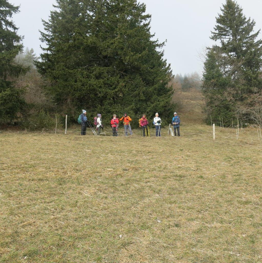 10h15, bien froid et quelques brumes au départ de la ferme des Rapilles aux Jaux (Engins) 860 m, mais rapidement au soleil pour remonter les premières prairies, sous la surveillance de « gilets oranges » des chasseurs pas très contents de nous voir sur leur terrain favori.